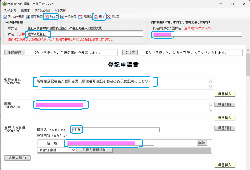 - [申請書作成] - [不動産登記申請書] - [登記申請書(権利に関する登記)【署名要】] - [登記申請書(権利に関する登記)(22)登記名義人の住所変更【署名要】]を[選択]する。