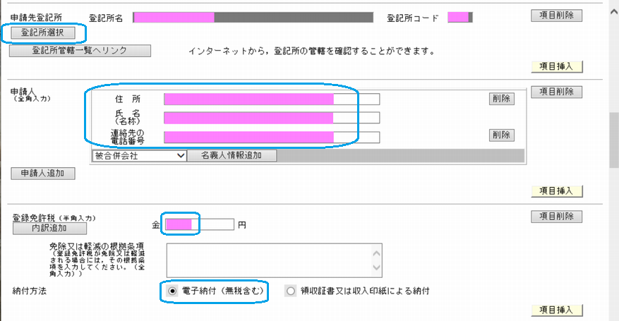 - 申請先登記所の登記所名と登記所コードは[登記所選択]から対象住所を管轄する登記所を選択する。対象物件の住所を管轄する登記所は法務局ホームページで確認できる。